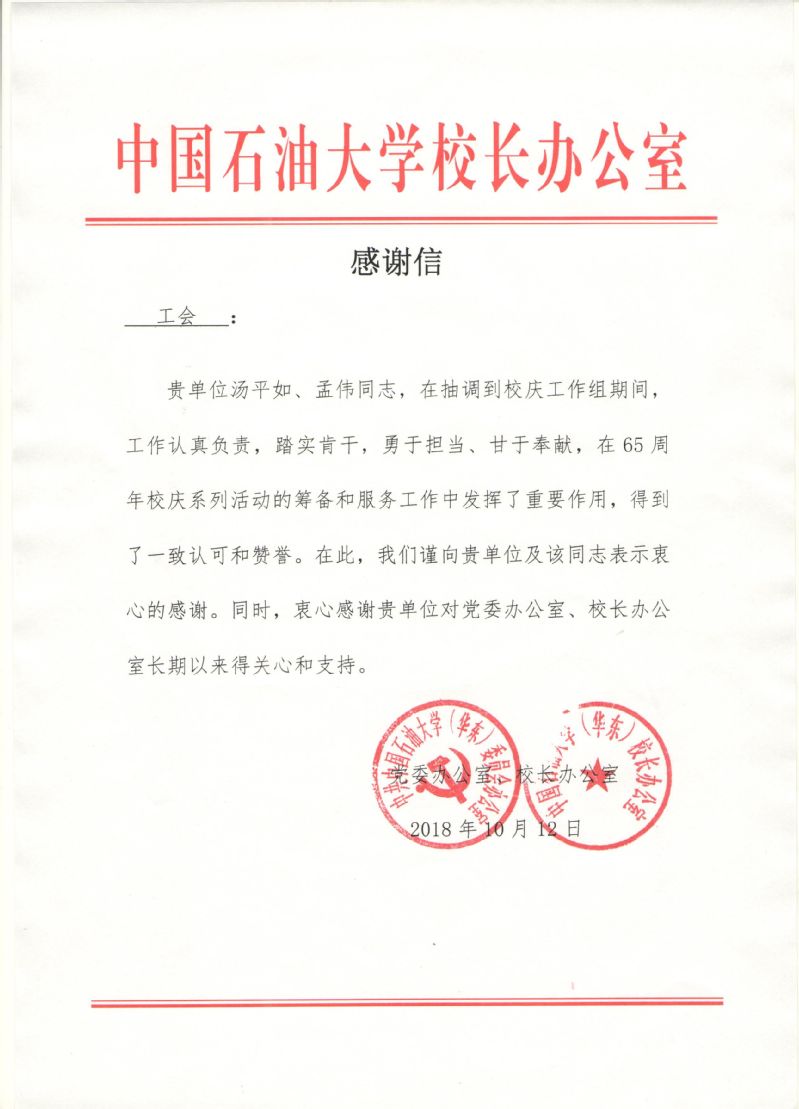 贵单位汤平如、孟伟同志,在抽调到校庆工作组期间,工作认真负责,踏实肯干,勇于担当、甘于奉献,在65周年校庆系列活动的筹备和服务工作中发挥了重要作用,得到了一致认可和赞誉。在此,我们谨向贵单位及该同志表示衷心的感谢。同时,衷心感谢贵单位对党委办公室、校长办公室长期以来得关心和支持。