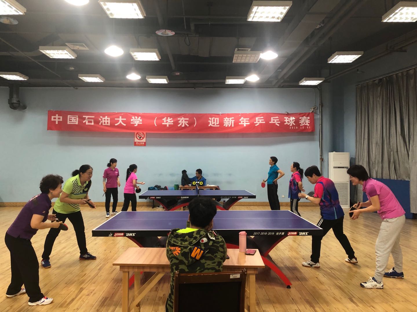 12月1日至4日,迎新年乒乓球赛在学校体育馆乒乓球馆举行。本次比赛由校工会主办,教职工乒乓球协会承办,共有8支男队、4支女队24名运动员参加,其中包括5名即将出征参加首届全国高校“教授杯”乒乓球比赛的运动员。校工会主席张军到场观看比赛并和参赛队员合影留念。