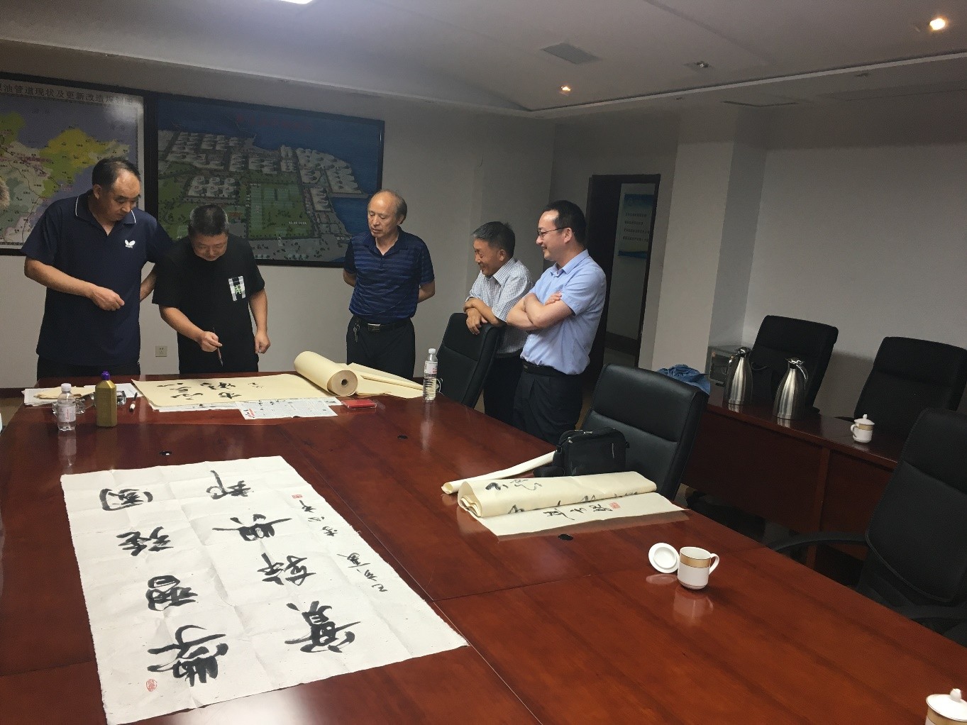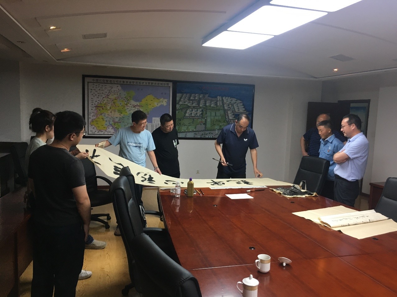 应杨杰伟书记邀请,李心市院长挥毫泼墨,赠予黄岛油库党委“不忘初心、牢记使命”、“学习强国、实干兴邦”等多幅书法作品,黄岛油库肖主任也以书法交流。