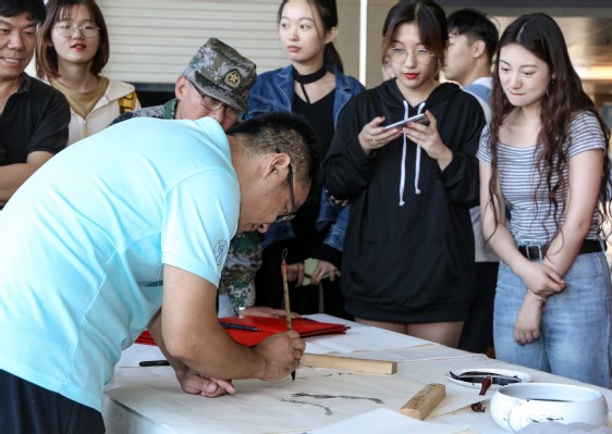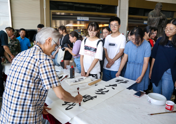 活动现场,人头攒动,求字学子络绎不绝。“铺纸、润笔、蘸墨、运笔”一幅“中华腾飞”遒劲有力得赫然现于纸上。短短两个小时里,师生各展所长,围绕“庆祝新中国成立70周年”主题,饱含深情地创作了多幅风格多样的书画作品。“为青春加油!为祖国奉献!”前来观摩的学生激动地说,笔会不仅让自己欣赏了高水平艺术,同时求字勉励自己刻苦奋进。
