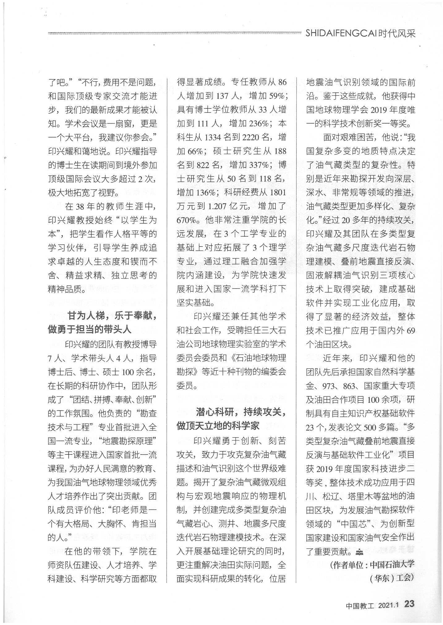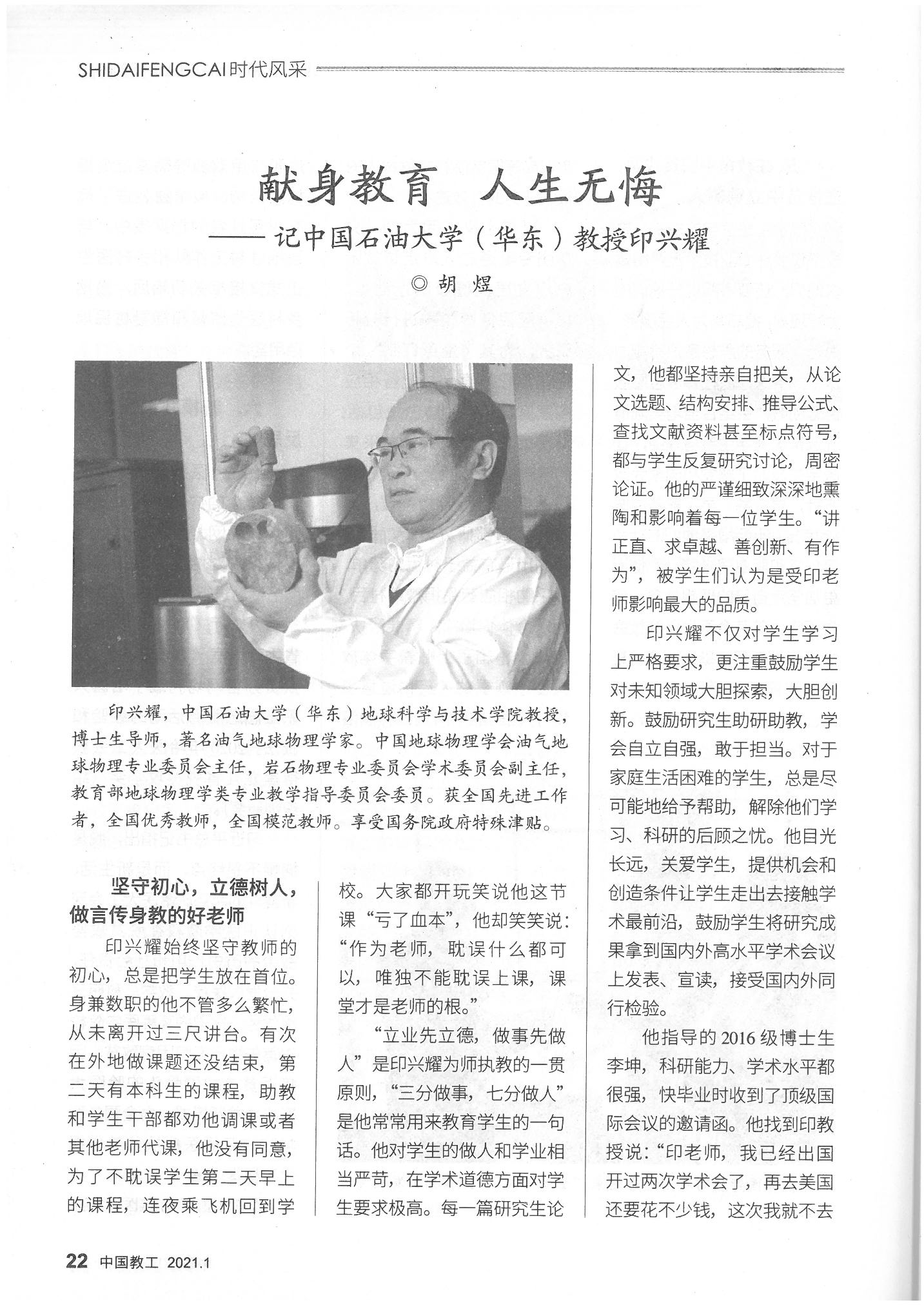 中国教工:献身教育 人生无悔——记yl88858永利官网(华东)教授印兴耀