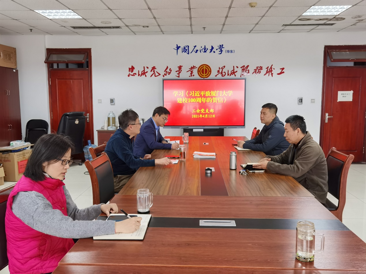 4月12日,工会党支部召开党员学习会议,集体学习习近平总书记致厦门大学建校100周年的贺信精神。会议由支部书记、工会副主席汤平如主持,工会主席张军及支部全体党员参加会议,党支部副书记孟伟领学贺信。