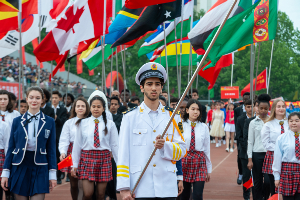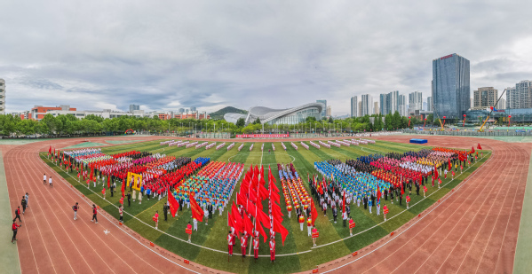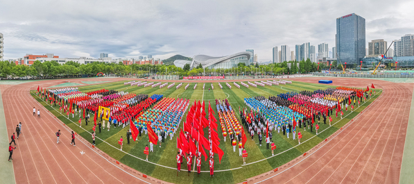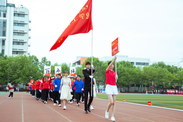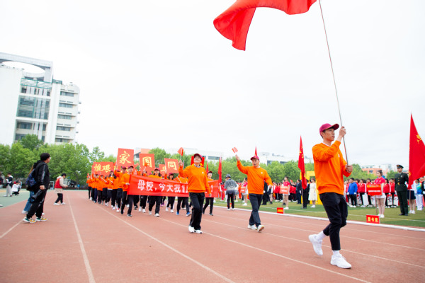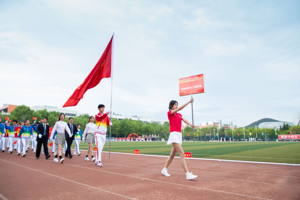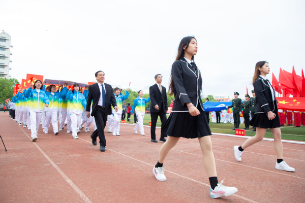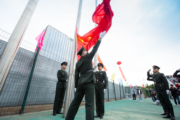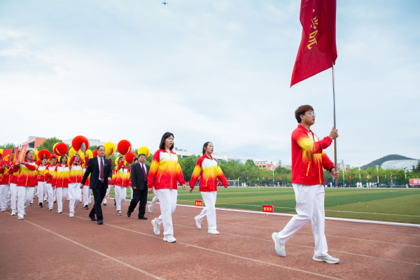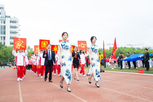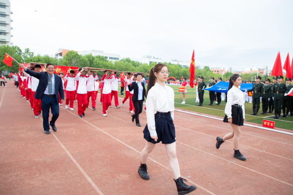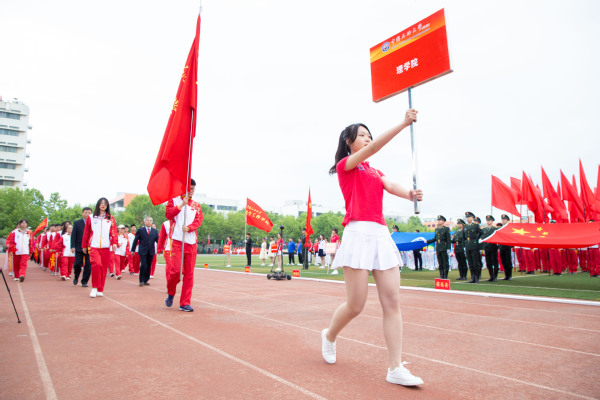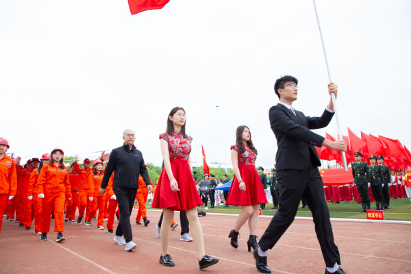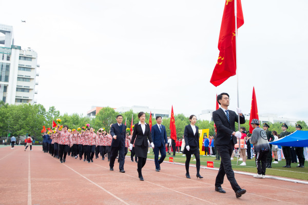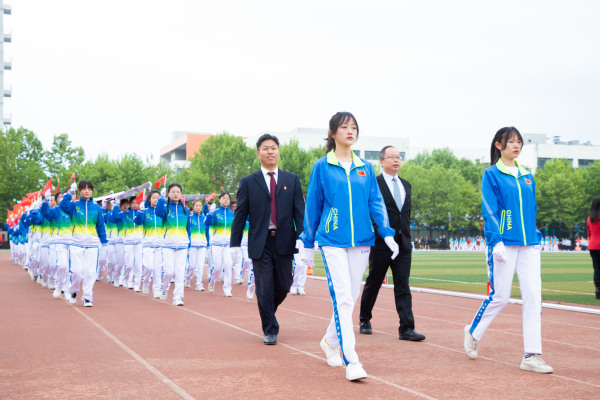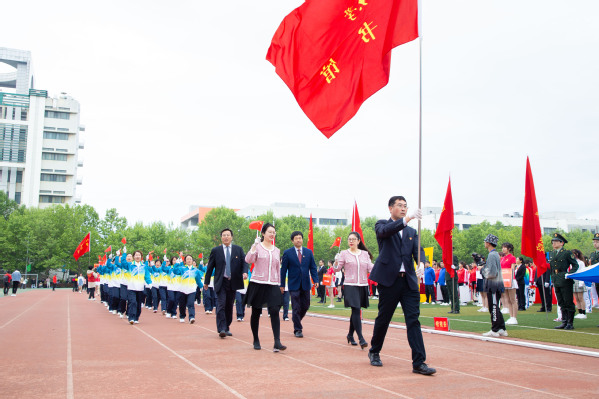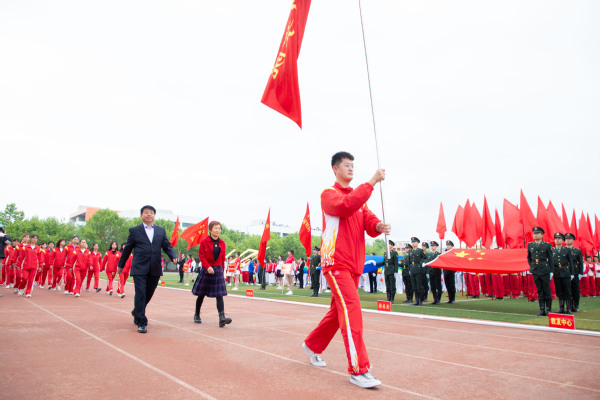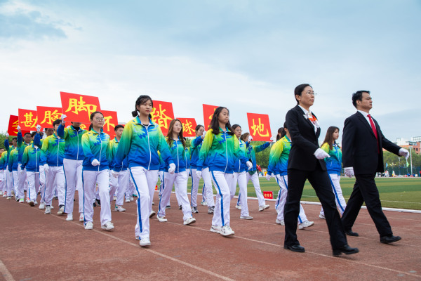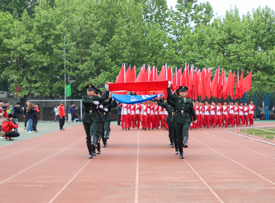 整齐划一的步伐,铿锵有力的口号,全神贯注的神情,一丝不苟的态度,走在最前方身着军装的护旗手们带领着红旗方队缓缓走来,紧随其后的是裁判员、各教职工、学生代表队,各代表队色彩斑斓的着装使运动场上洋溢着青春亮丽的气息。“起来,不愿做奴隶的人们……”伴随着庄严的国歌,在全体师生的注目礼中,五星红旗缓缓升起。