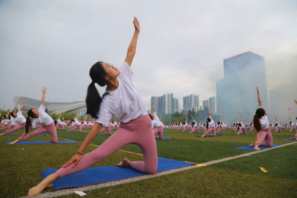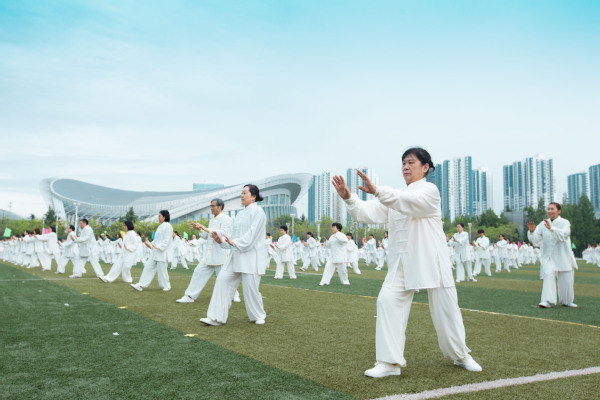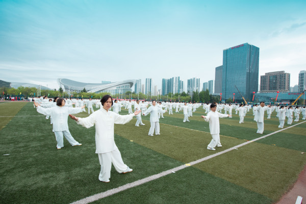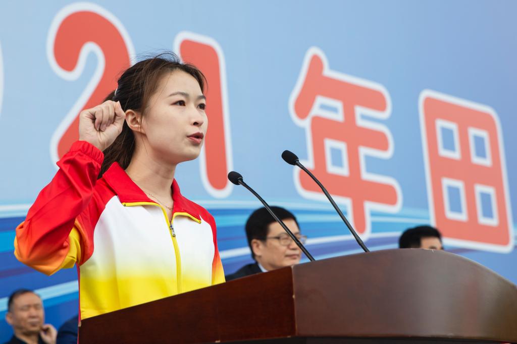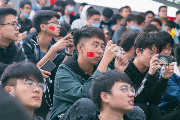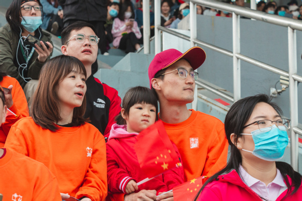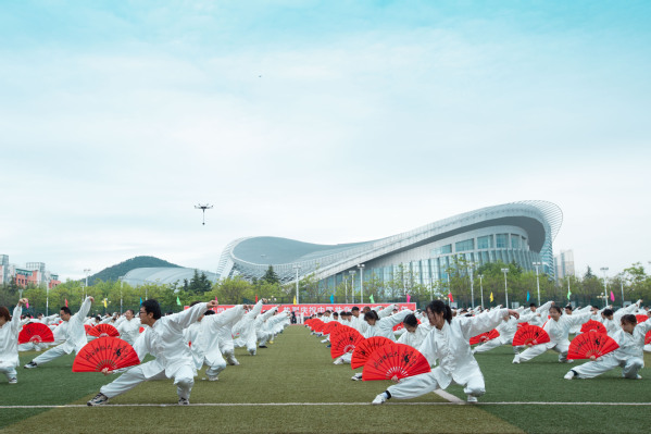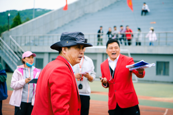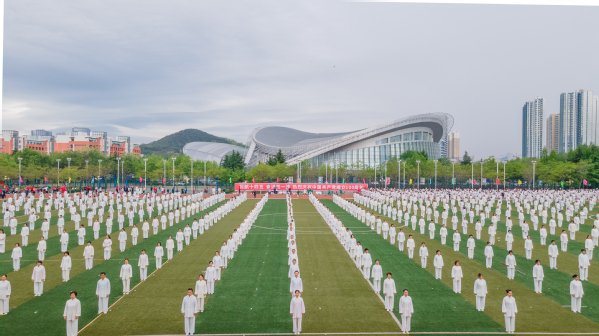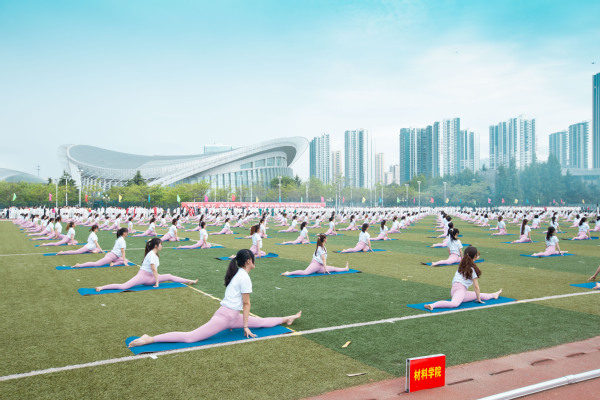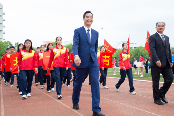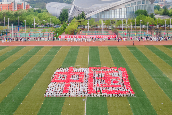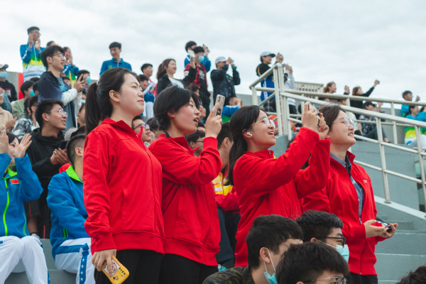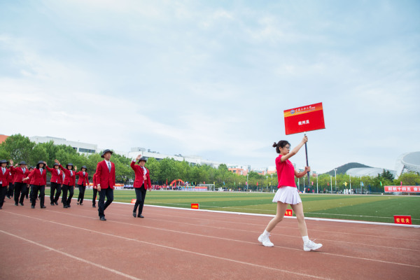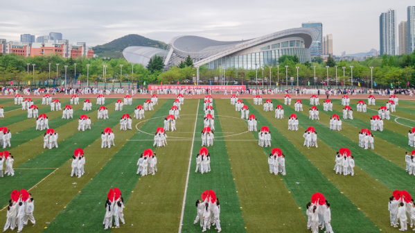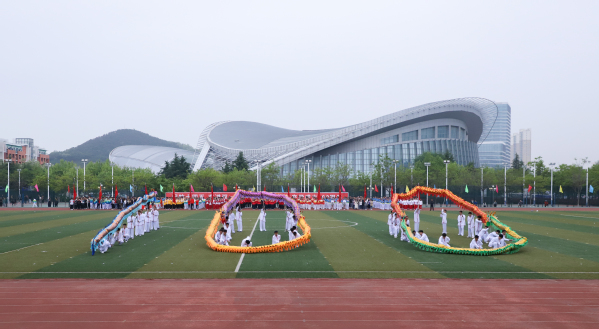 运动场上一片欢腾。学生柔韧的瑜伽表演伴随着《歌唱祖国》的旋律,展现出大学生的青春朝气;利落精到的太极拳表演彰显了教职工的昂扬风采;刚柔并济的太极扇一展文化之韵,气势恢宏,队伍跟随激昂的音乐变换队形,用太极扇摆出“中国共产党”“100”等字样,献礼建党100周年。在观众的阵阵欢呼与掌声中,2021年田径运动会正式拉开了大幕。