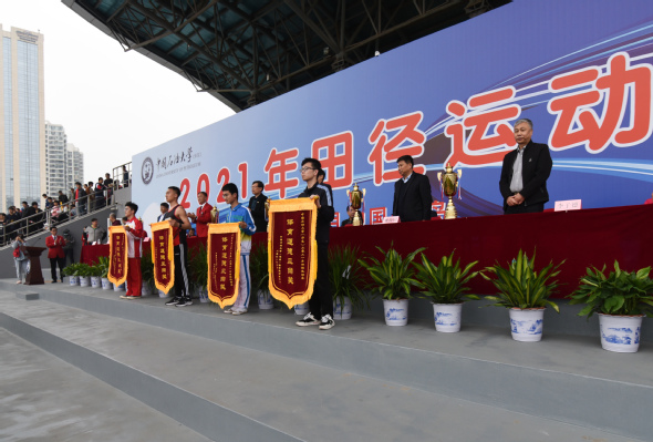 校体育运动委员会主任、党委副书记万云波、工会主席张军、体育教学部主任王锋、书记王永胜、副主任王海滨、学生处处长姚海田、财务处处长耿彦军、保卫处处长李子德、后勤管理处处长姜永增为获奖运动员和单位颁奖。