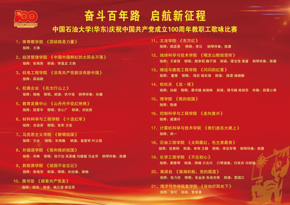 全校21支合唱队,2000多名教职工,以嘹亮的歌声献礼党的百年华诞。经过紧张激烈的角逐,最终离退处、石油工程学院、校机关、教育发展中心、储运与建筑工程学院、yl88858永利官网和新能源学院获得比赛一等奖;文法学院、校属企业、理学院、化学工程学院、控制科学与工程学院、图书馆、计算机科学与技术学院、海洋与空间信息学院、机电工程学院、外国语学院、经济管理学院、材料科学与工程学院、马克思主义学院和体育教学部获得二等奖。学校党委副书记万云波,学校党史学习教育领导小组办公室主任、组织部部长张卫东,党委宣传部部长沈刘峡,工会主席张军观看比赛并为获奖单位颁奖。