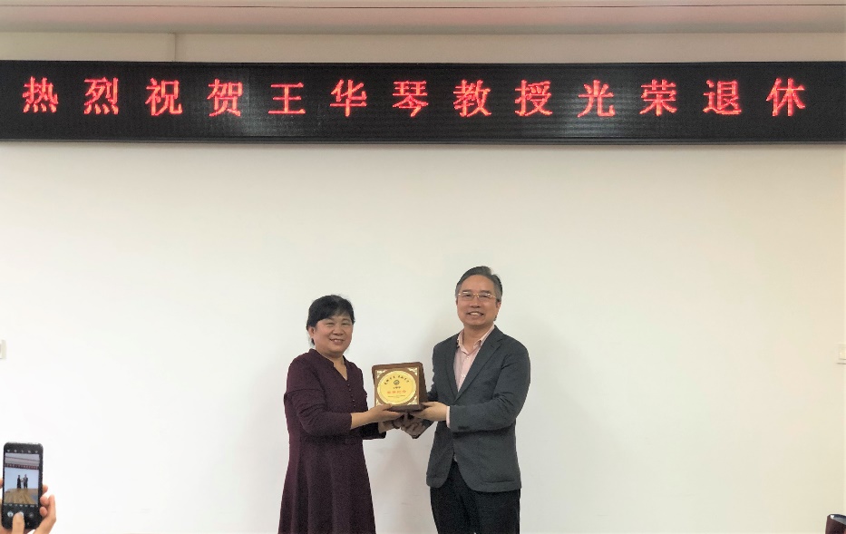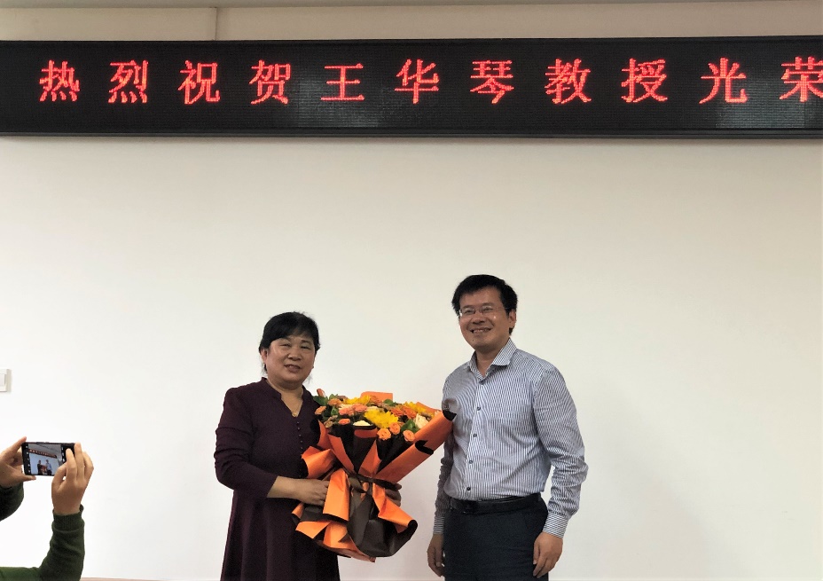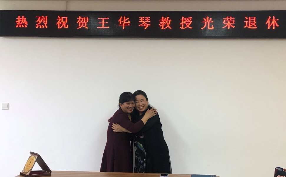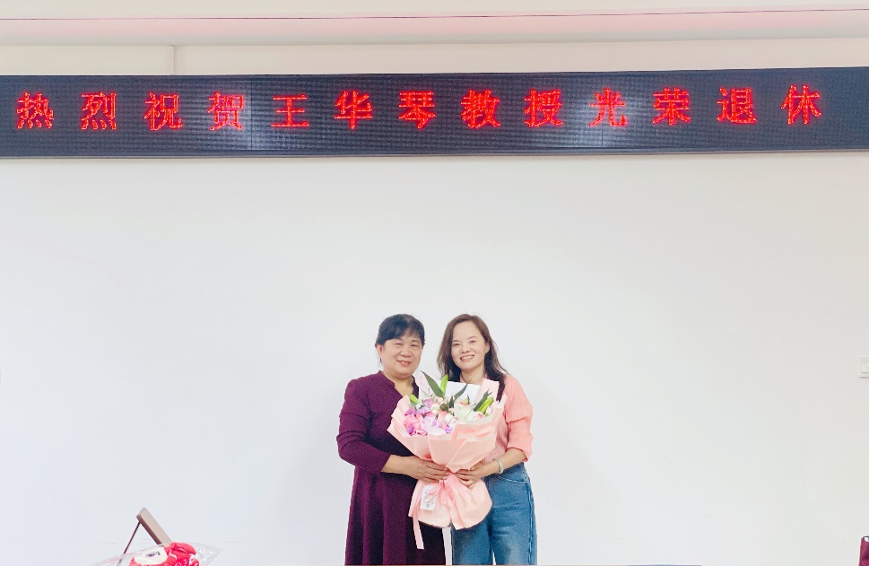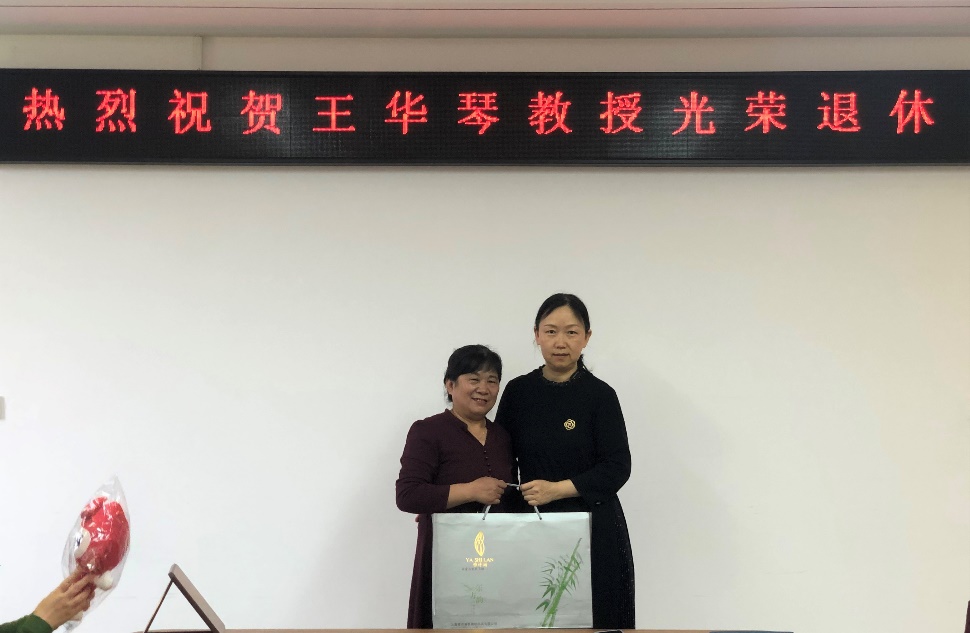 朱惠平书记、毛浩然院长、郭月琴主席、董金娣主任和教师代表牛力维老师依次向王华琴教授送上了鲜花和纪念品。