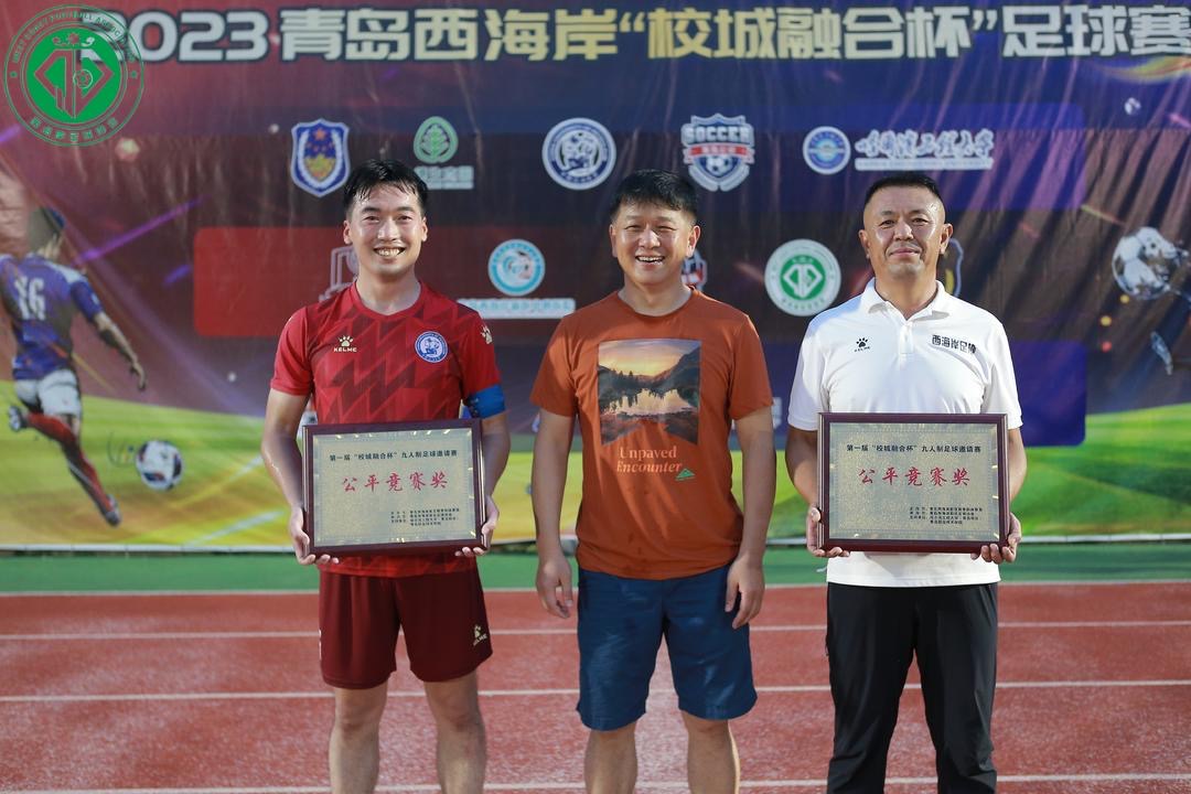 本届“校城融合杯”足球邀请赛历时一个多月,进行了52场比赛,吸引了区直机关、开发区公安局、铁山街道、yl88858永利官网(华东)等共计15支队伍参赛。在校工会的大力支持下,我校代表队由体育教学部主任周伟担任领队、教师陈晓伟担任教练,小组赛中以5:2战胜山东科技大学并作为唯一高校代表队进入淘汰赛。在四分之一淘汰赛中0:1惜败铁山街道队,后在排位赛中通过点球大战连克黄岛区公安局队、开发区公安局队,最终获得第五名,参赛高校代表队中最好成绩,学校获“公平竞赛奖”,张鑫获“最佳球员奖”。