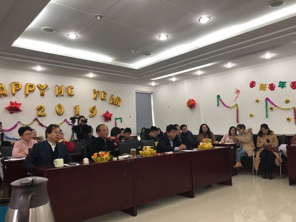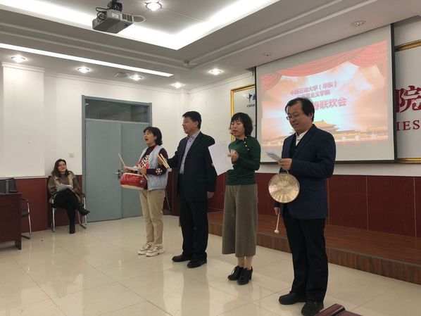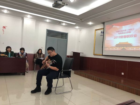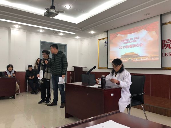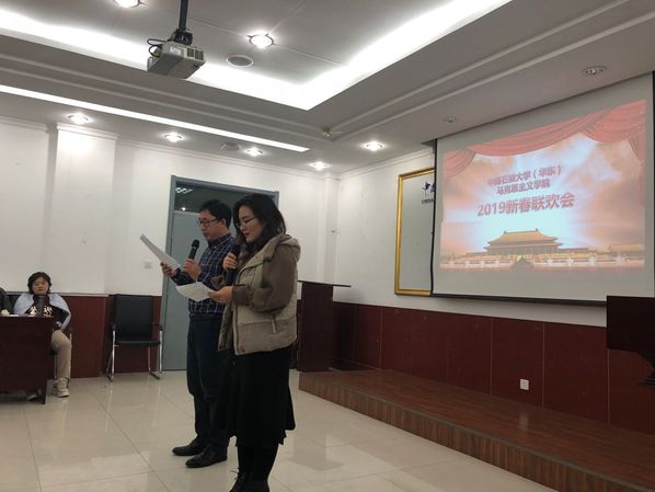 2019年1月12号下午三点,马克思主义学院全体教职工在文理楼457举行了一年一度的新年联欢会。本次联欢会由叶立国与张会芸两位老师担任主持人,学院各部门分别贡献节目,是一场充分展示老师们轻松活泼一面,充满欢声笑语的联欢会。第一个节目是崔军伟、孙念超、于翠萍三位老师带来的小品《看病》,三位老师轻松活泼幽默的表演,既为大家带来了欢声笑语,也对一些社会问题进行了辛辣的讽刺,娱乐中发人深省;第二个节目是石超老师的吉他弹唱《山海间》,这也是石老师第一次挑战弹唱表演,虽然非常紧张,但也实现了自我突破;后面的节目之间还穿插着游戏环节,“你来比划,我来猜”,老师们都积极参与,尤其是司江伟书记、王建军院长和夏从亚老师,都为我们带来了轻松幽默的表演;除以上节目以外,值得一提的是张瑞涛副院长带来的两个节目,“单口相声”和“三句半”,前一个节目,张老师以其冷幽默抖响三个大包袱,逗得大家捧腹大笑;后一个节目“三句半”是司江伟书记写词,联合岳金霞、景艳菊、张瑞涛三位老师共同表演,给大家带来欢声笑语的同时,也送上了对马院全体老师的新年祝福。岳金霞老师还为我们演唱了《猪之歌》,提前向即将到来的猪年送上祝福;张会芸老师的“脱口秀”以“吐槽”的方式总结了2018年的经历,以一种自信、轻松的姿态面对过往、迎接新年;“概论”教研室的宋海儆、王庆忠、郎帅等几位老师还为我们带来了怀旧歌曲串烧,优美的歌声伴着浓浓的回忆。将近两个小时的联欢会,伴随着老师们一个个精彩的节目很快就结束了,但欢乐祥和的气氛却久久不能散去,随着寒假的到来,相信这次联欢会能够给马院这个大家庭带来更加温暖的亲情与更加牢固的凝聚力。