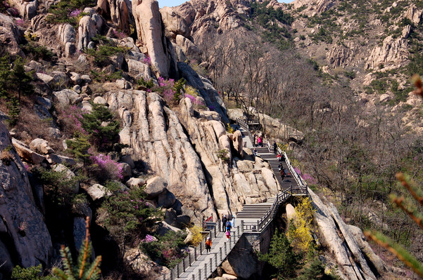 始入大珠山,便感受到与平日生活中不一样的景致。最先映入眼帘的是开阔的湖光山色,远处层峦巍峨起伏,遥映在粼粼湖水。沿着湖边的步道上行,清新的空气直抒胸臆。清明节还未到,但珠山秀谷的花儿已经开得甚好。山坡上遍是杜鹃,随着风的吹动,摇曳成一片粉紫色的花海。其间点映着鹅黄的迎春,明快活泼。向上的山道被花丛包围,珠山秀谷仿若温柔的少女,无需言语,便告知了春的消息。老师们纷纷在此停留赞叹,摄影高手们也不能错过这个场景,“快来快来,我帮你们拍一张!”“这个姿势好,微笑看镜头哦!”大家聊着、笑着、闹着,一起向山顶前行。
