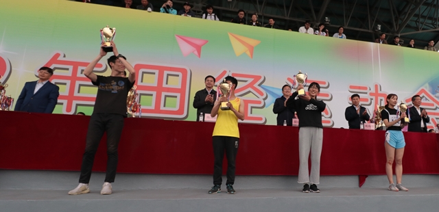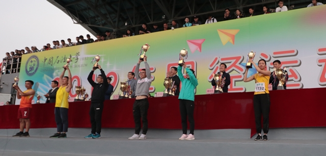 学生王文浩、苏鑫代表学院领学生乙组男子团体第一名和女子团体第一名奖杯(右三和右四)